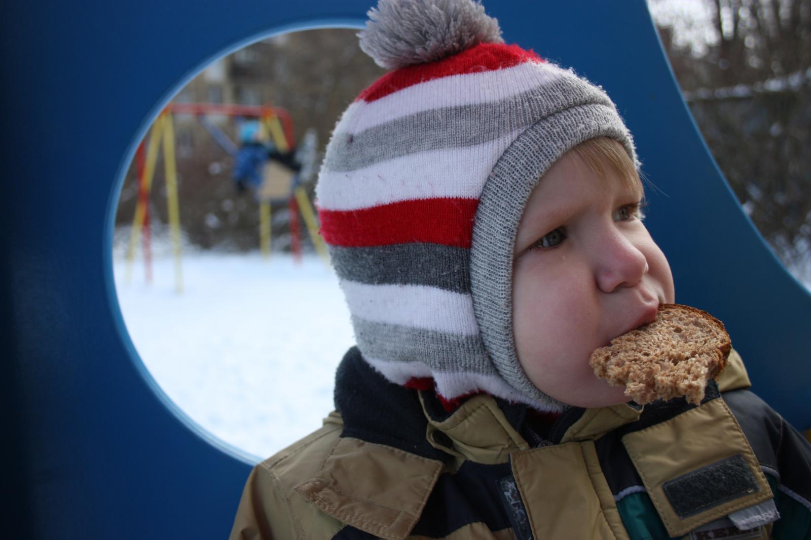 Птички, по ходу, тоже ослепли от всего этого весеннего великолепия, и не прилетели на рассыпаемые нами обильно крошки. Пришлось взять труд сожрать хлеб в свои руки. То есть зубы: