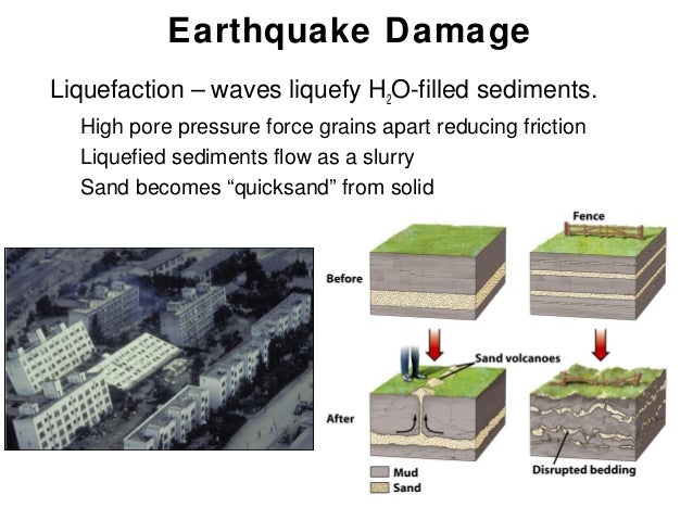 Лично пережил сильное землетрясение в Новой Зеландии в 2011 и был свидетелем явления которое называется разжижение грунтов или liquefaction. После землетряса жидкую глиноподобную субстанцию выперло наверх и многие районы города погрузились в глину, вернее глина залила всё и строения и машины. В некоторых местах высота заноса была до метра, потом выгребали весь город экскаваторами и над городом в течении года стоял пылевой белый туман.